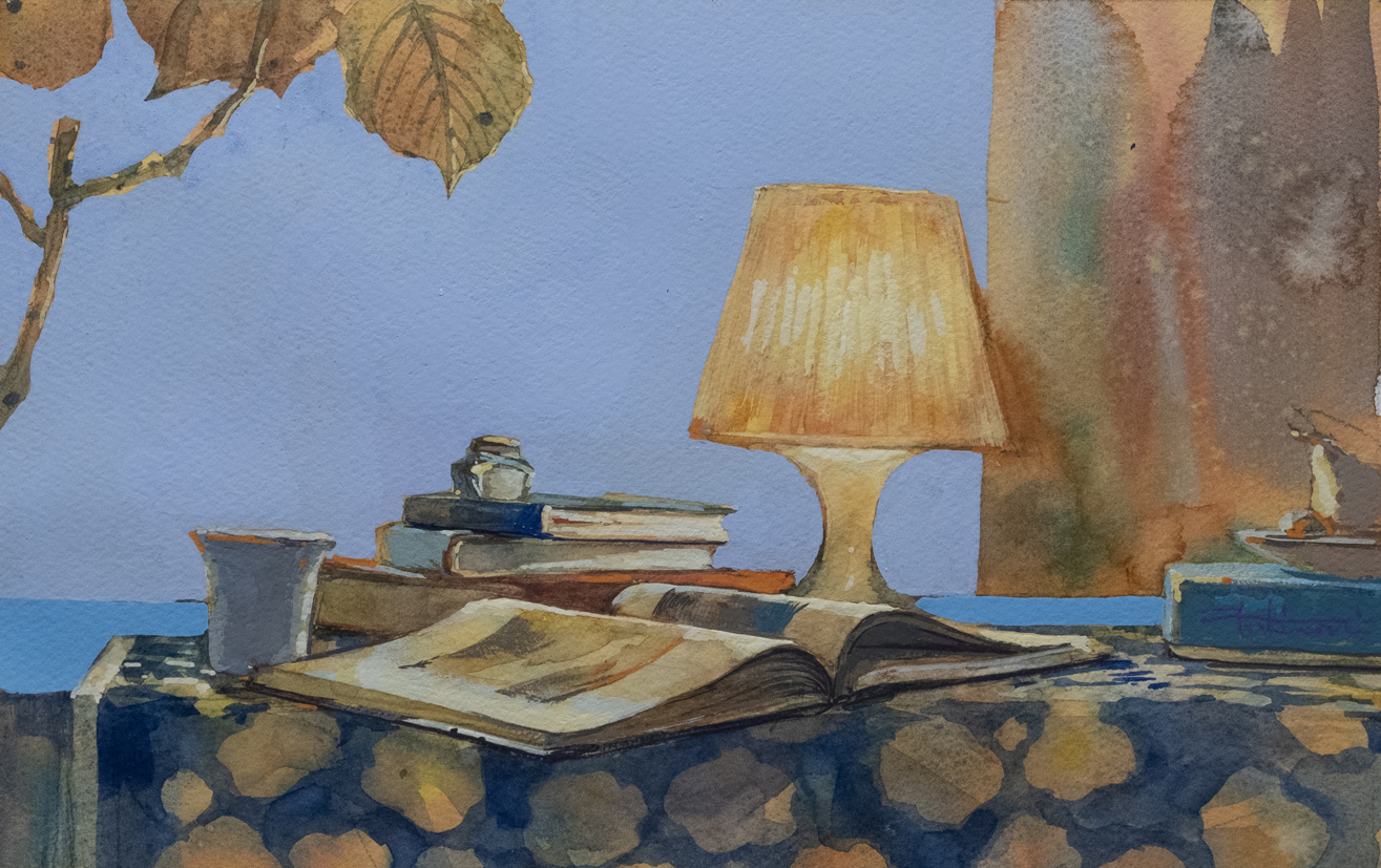 「テーブルランプと読みかけの本」